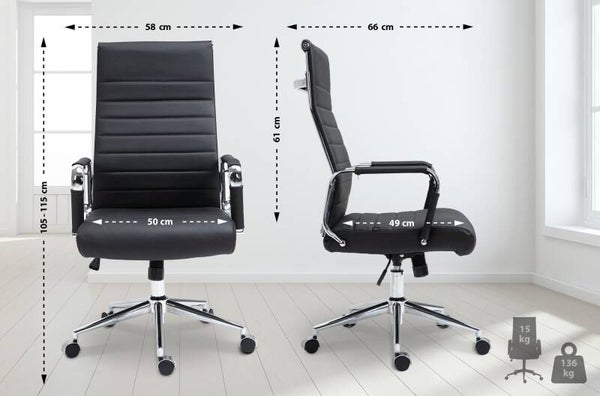 Dieser exklusive Bürostuhl Kolumbus überzeugt nicht nur mit seinem modernen Look, auch in Sachen Komfort kann ihm keiner etwas vormachen. Seine hochwertige Polsterung sorgt für ein angenehmes Sitzgefühl über mehrere Stunden hinweg. Für den Bezug des Sitzes und der Rückenlehne wurde hochwertiges Rindsleder verwendet. Die Sitzhöhe ist stufenlos verstellbar und garantiert ein ergonomisches Sitzen. Des Weiteren ist der Schreibtischstuhl mit einem Wippmechanismus versehen, der für mehr Bewegungsfreiheit sorgt. Die Stabilität wird durch das Chromoptik Metallgestell gewährleistet. Durch die fünf Leichtlaufrollen kann man leicht und locker über den Boden rollen - egal ob auf Hart- oder Teppichböden.